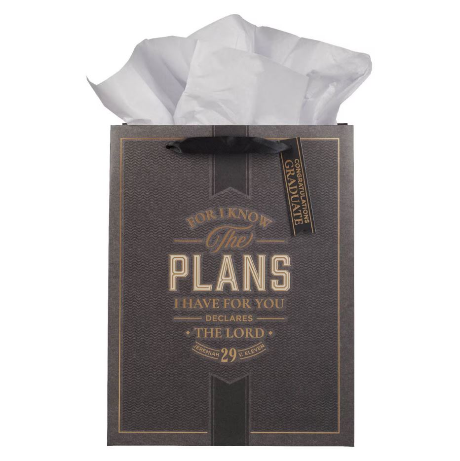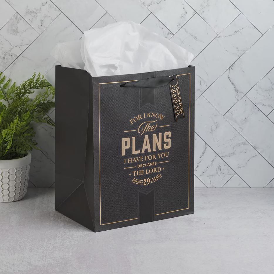 Graduating high school or college is a momentous occasion in a young adult's life, so mark it with The Plans Charcoal and Gold Large Portrait Gift Bag. Wrapping your gift in this inspirational gift bag is a meaningful and stylish way to honor a graduate's achievement while pointing him to God's promise for his future.