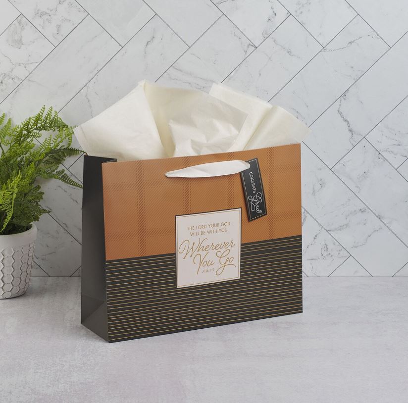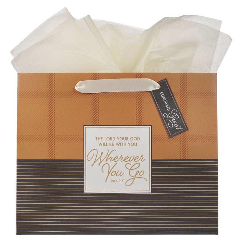 Celebrate graduation with a gift bag that delivers a promise straight from Scripture with the Wherever You Go Brown Striped Plaid Large Landscape Gift Bag. This sophisticated gift bag, with its encouraging sentiment, will make your graduation gift all the more memorable.