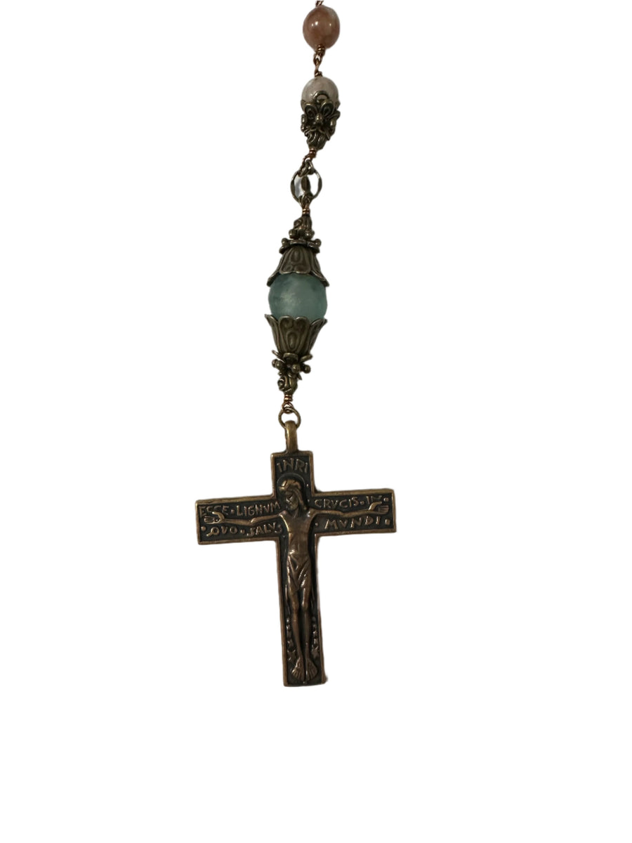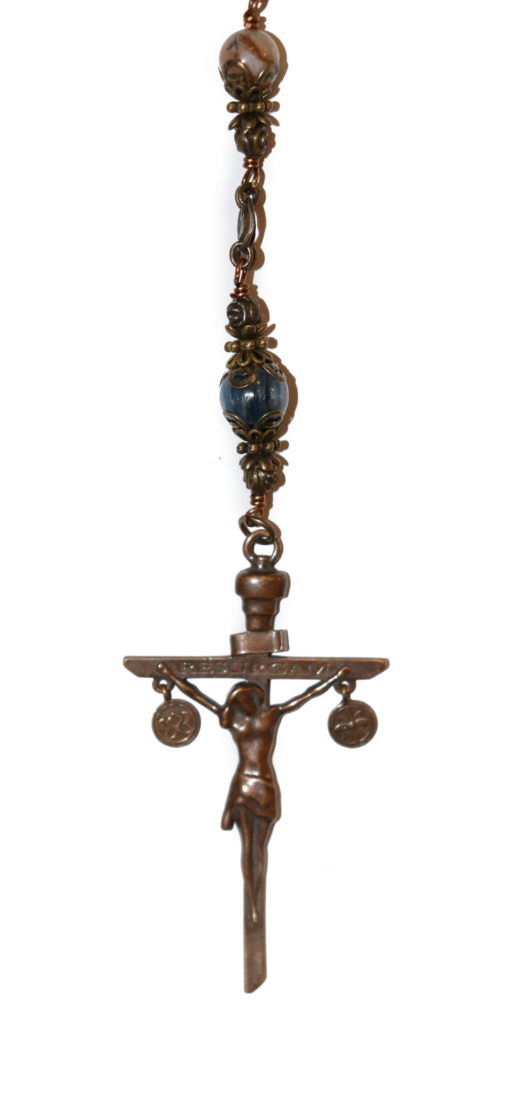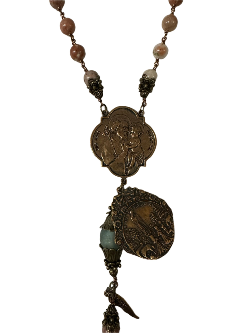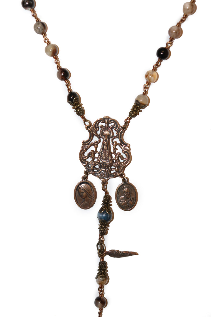 The beads are genuine high quality natural Dendritic Fern Agate with Kyanite stones. The centerpiece medallion depicts our Lady of Victory with angels and an inscription reading "1693". Attached to the centerpiece are tow saint medallions depicting our Lady of Medjugorje and St. Peter the Apostle.