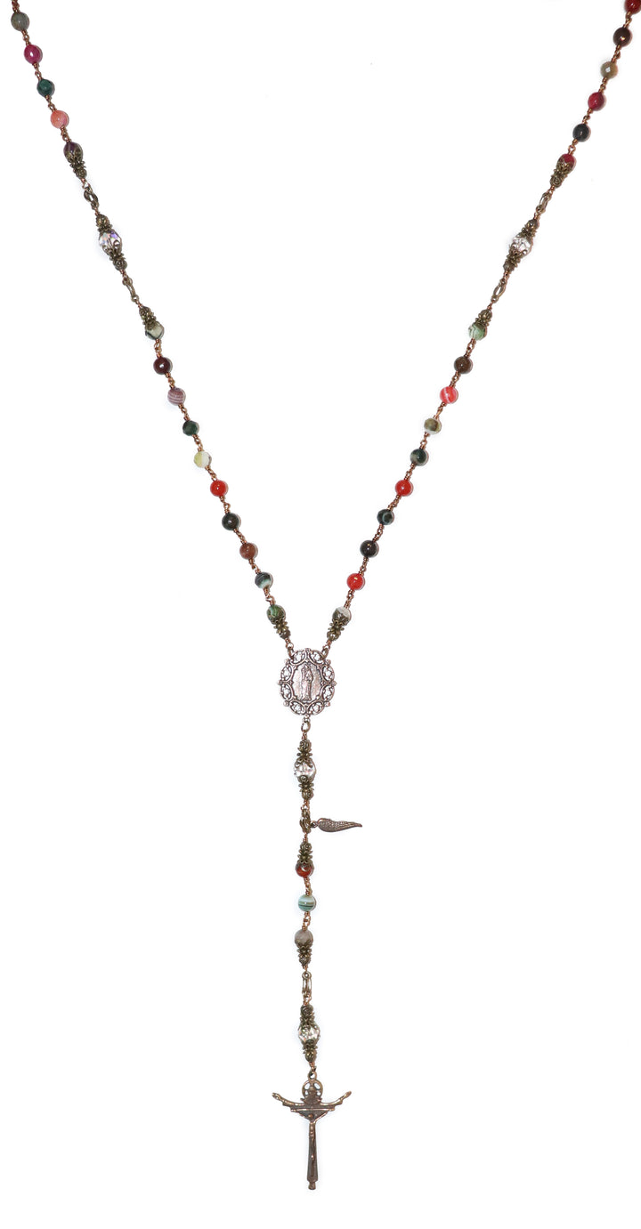 The beads are genuine high quality faceted multi-colored Agates and clear Swarovski crystals from Austria. The centerpiece medallion depicts our Blessed Mother Mary with child Jesus. The crucifix details the trinity cross with God the Father, Jesus Christ our Lord, and the Holy Spirit in the form of a Dove.