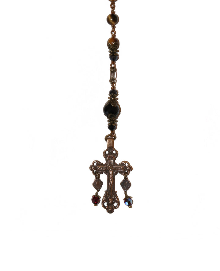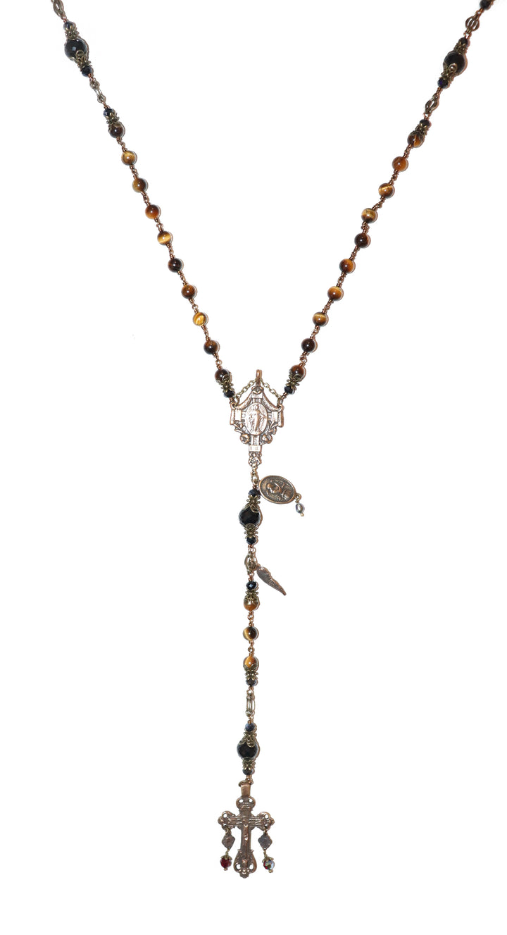 The beads are genuine high natural Tiger Eye, Charcoal crystals. The centerpiece medallion depicts Our Lady of Grace standing before the holy cross. Attached to the centerpiece is a saint medallion depicting St. Gabriel the Archangel with a Pearl dangle.