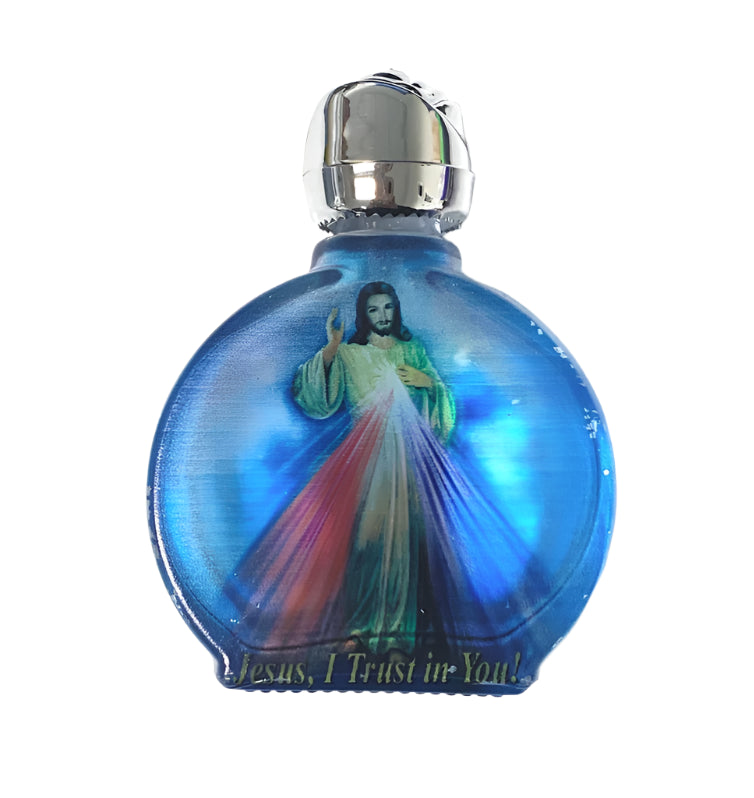 Decorative stained glass holy water or oil bottles, featuring the image of Divine Mercy. Fill at your local parish.