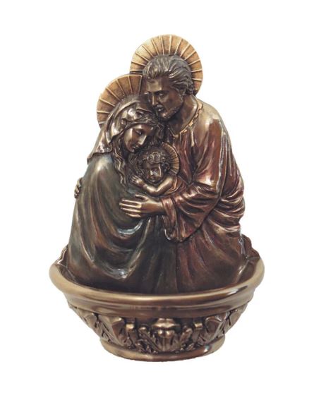 - Holy Family holy water font in lightly hand-painted cold cast bronze