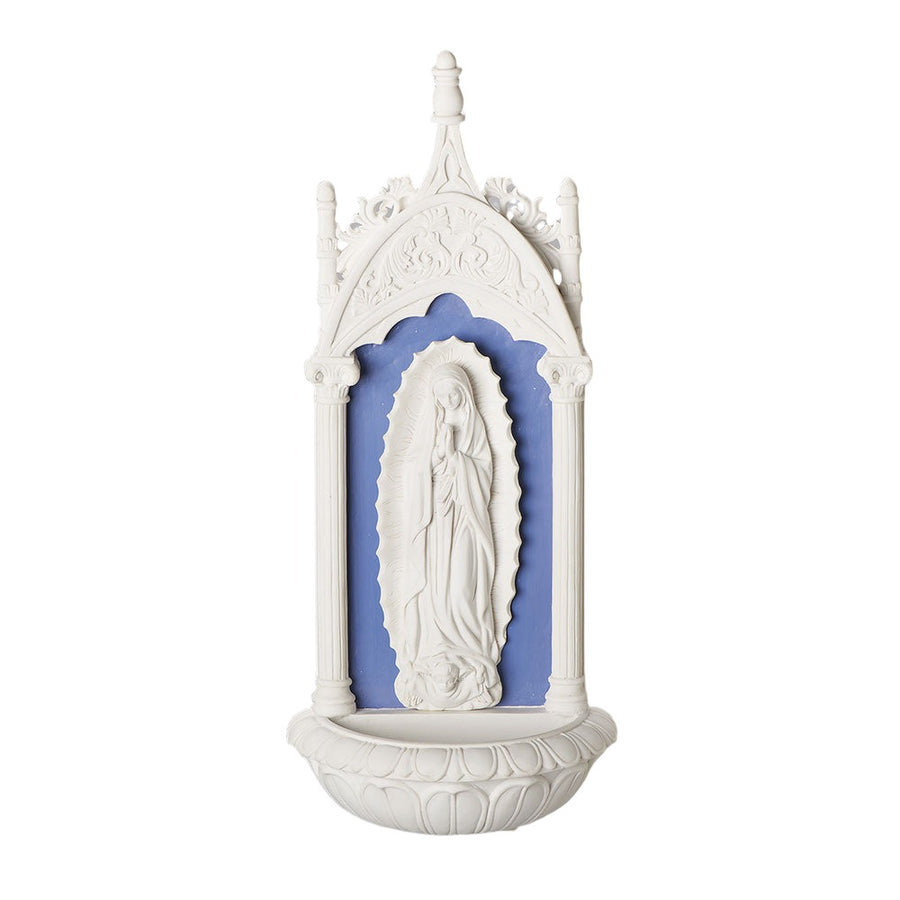 - Water font figurine features Lady of Guadalupe with ornate gold tone finish