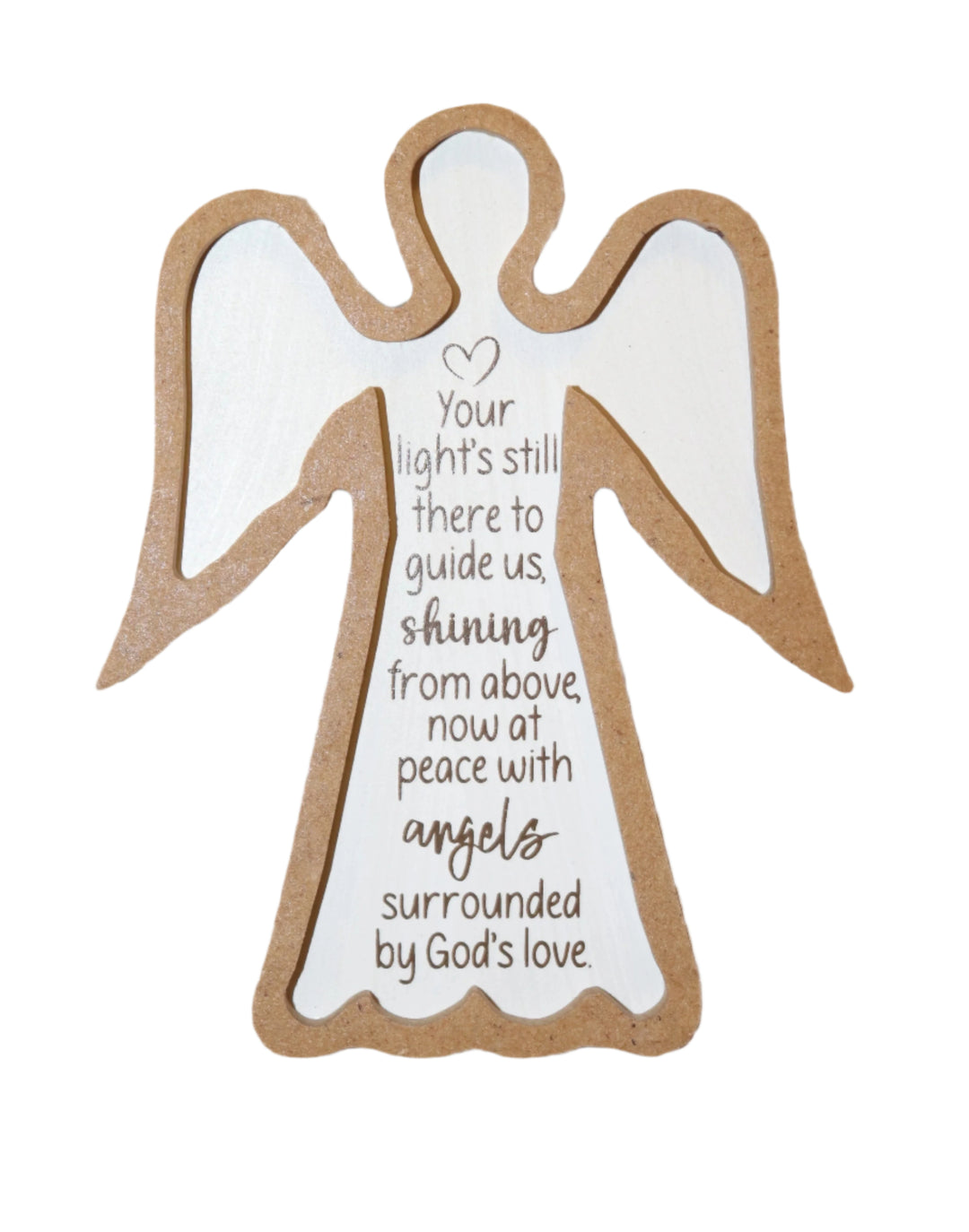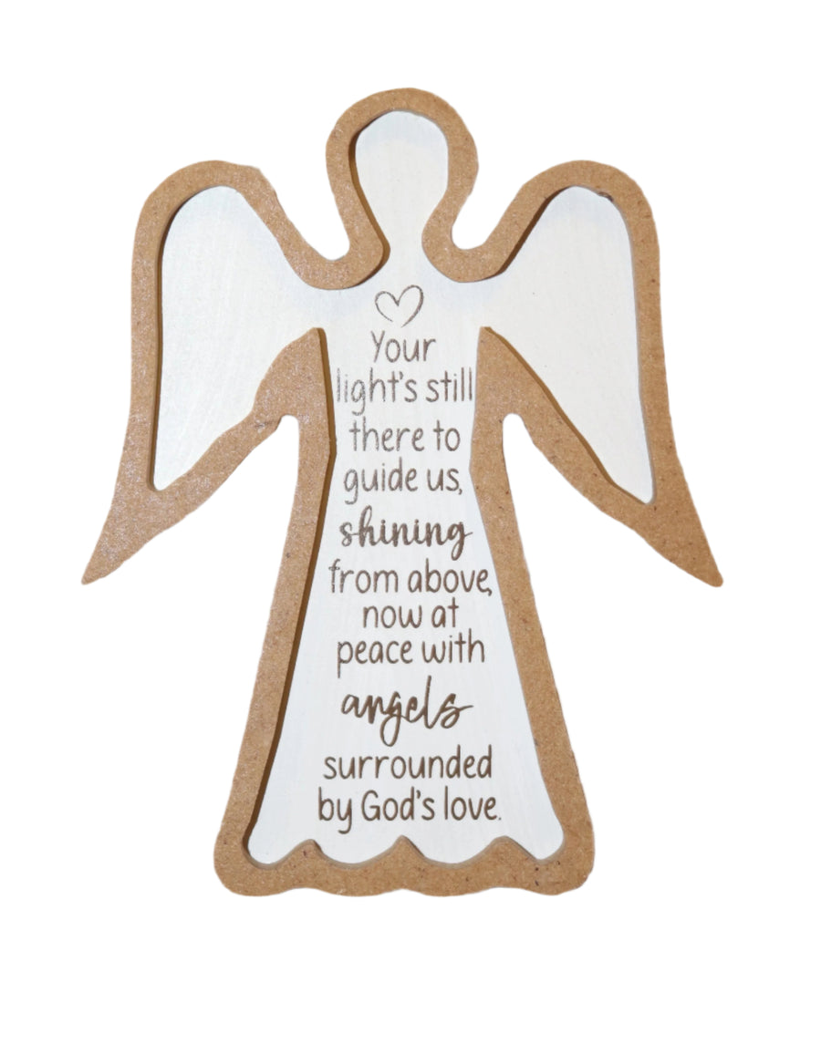 Messages from Heaven for your home or desk, delivered by these framed, standing angels.  Screen-printed MDF.  Measures 5"H x 4"W x 1"D. Boxed.