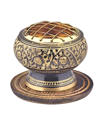 This Brass Charcoal Burning Resin Incense Burner with screen comes with a round wooden coaster. The removable screen on this incense burner allows ash to fall through, while keeping the charcoal and resins on top.
