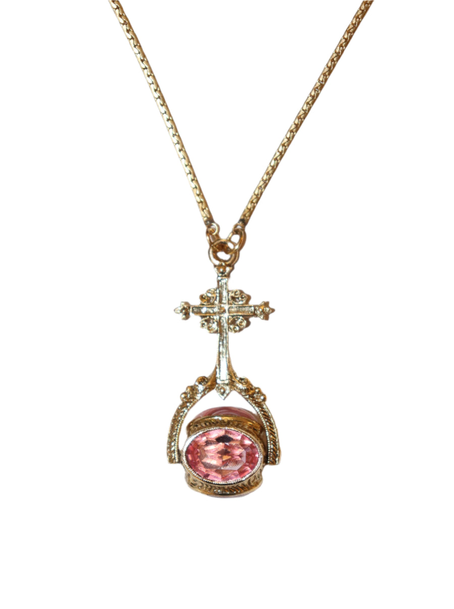 14K Gold Dipped Cross Multi Hue Pink Stone
