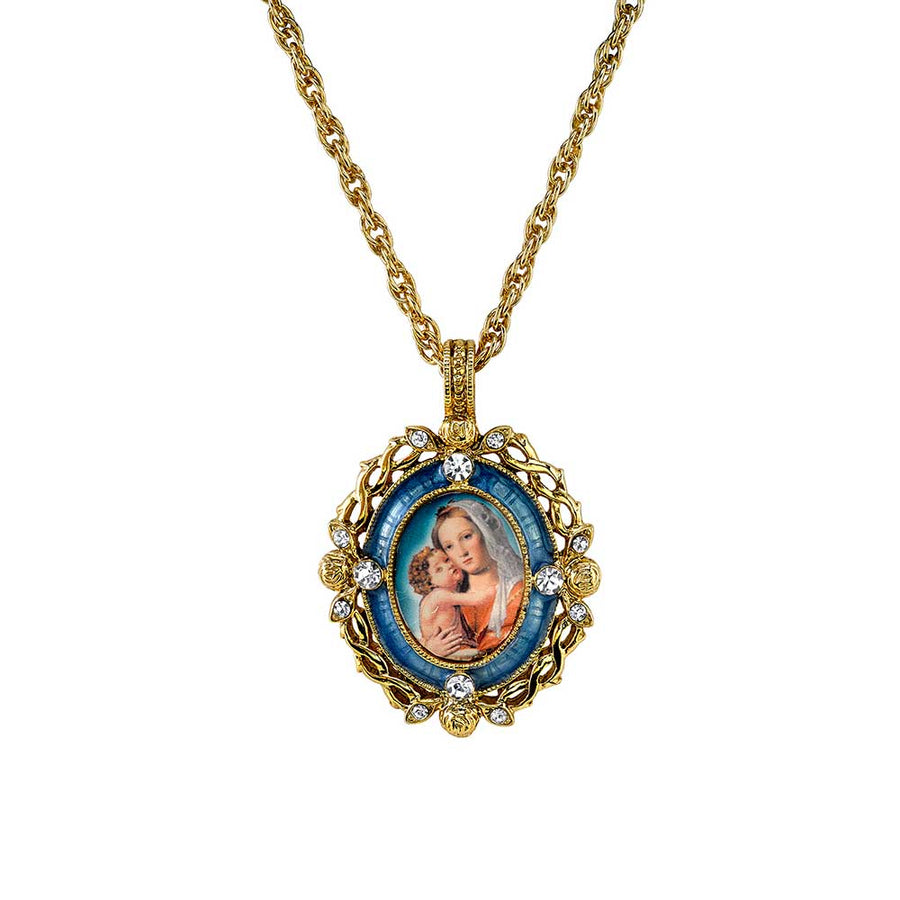 This beautiful detailed 14K gold-dipped pendant features the Virgin Mary and Child inside a blue enamel oval with crystal accents. Beautifully handcrafted and inspired by Raphael's Madonna del Granduca painting. Comes packaged in a Symbols of Faith gift box.