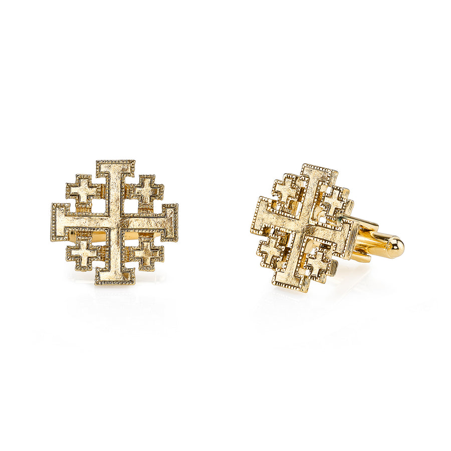 14K gold-dipped cuff links featuring the Jerusalem cross, a Christian symbol consisting of a large surrounded by four smaller plain crosses. A handsome and stylish expression of faith. A stylish pair of cufflinks that are as fun and unique as the man who wears them. They make a perfect gift for him. Comes packaged in a Symbols of Faith gift box.