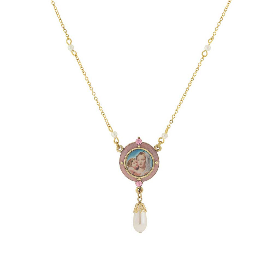 This delicate 14K gold-dipped pendant features and affectionate image of Mary and the Child Jesus. What a beautiful way to show your faith. Precisely handcrafted by artisans in enamel with simulated pearl and includes an 18" chain. Comes packaged in a Symbols of Faith gift box.