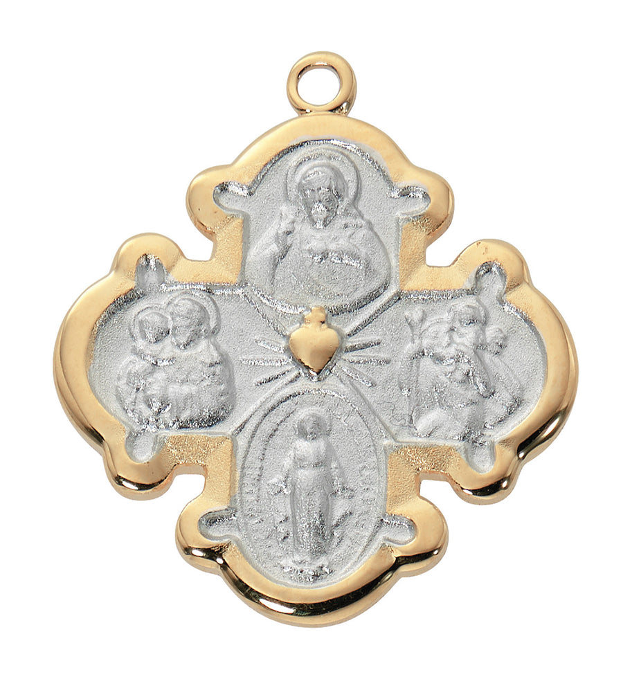 GOLD OVER STERLING SILVER TWO-TONE 4-WAY MEDAL WITH 18" GOLD OVER BRASS CHAIN. INCLUDES DELUXE GIFT BOX.