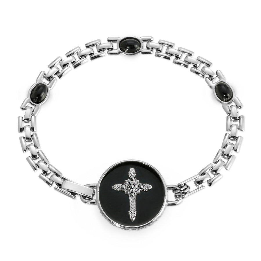Casual, with a touch of sophistication, the bracelet features a silver tone brick bracelet chain with oval stones and a round enamel center piece with a pewter cross and marcasite stone accents.
