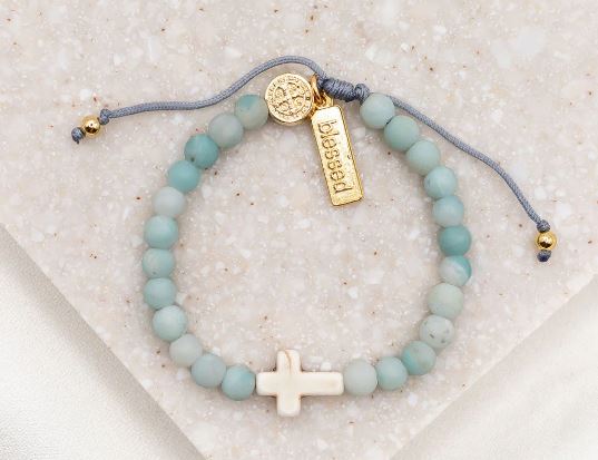 Sage Steele was given a Blessing Bracelet during a very tough season in her life. She felt the love and prayers woven into the bracelet lift her out of her sorrow and give her the courage to stand tall in humility and grace. Her bracelet became a touchstone to hold steady to God and carry on through the stormy waters. As she emerged with grace, she wanted to share that blessing with everyone. Her NEW Divine Grace Bracelets do just that. Made with amazonite, they bring to mind the ocean and offer the peace and tranquility of the water, and are woven with a howlite cross or Benedictine cross medals as a reminder that God's got this—He's got you!