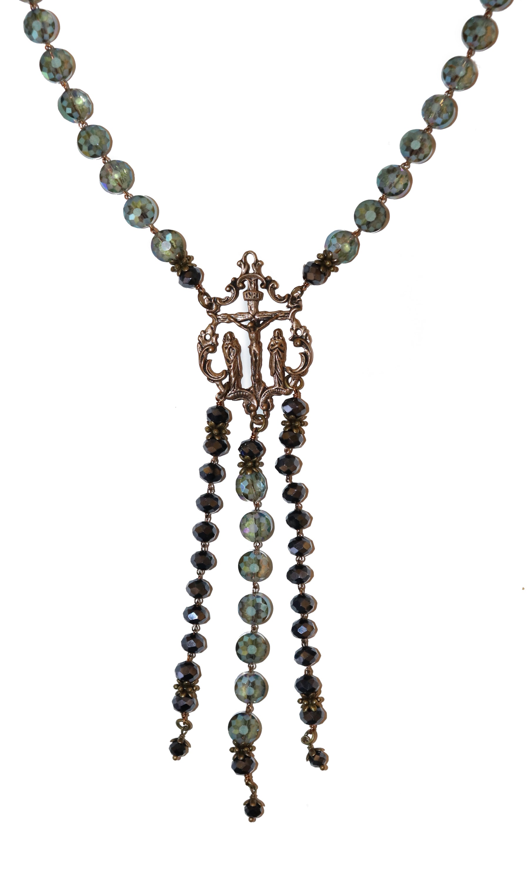 The beads are genuine high quality faceted Aqua crystals with Charcoal crystal accents. The centerpiece medal depicts the crucifixion scene detailing our Blessed Mother Mary and Mary Magdalene at the foot of the cross.