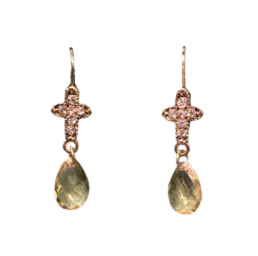 Gold Tone Cross Earrings with Crystal Topaz Teardrop