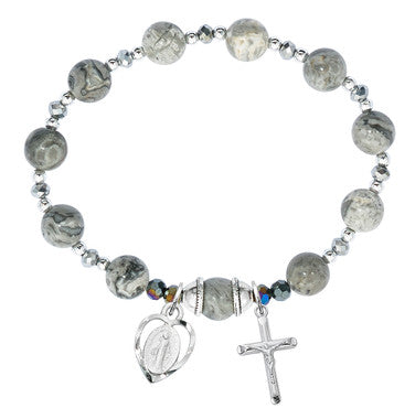Grey Marble Rosary Stretch Bracelet with Cross and Miraculous Mary Heart Piece