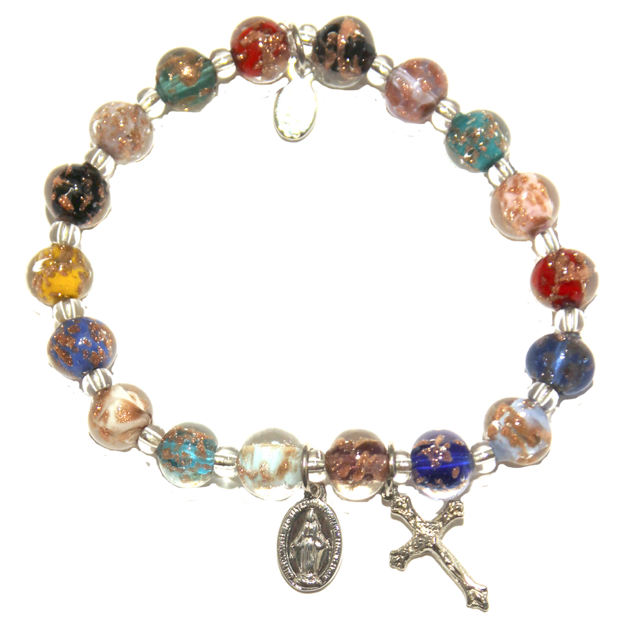 Genuine Murano Silver Tone Stretch Bracelet with Sommerso Beads. Includes Miraculous Medal and Crucifix.