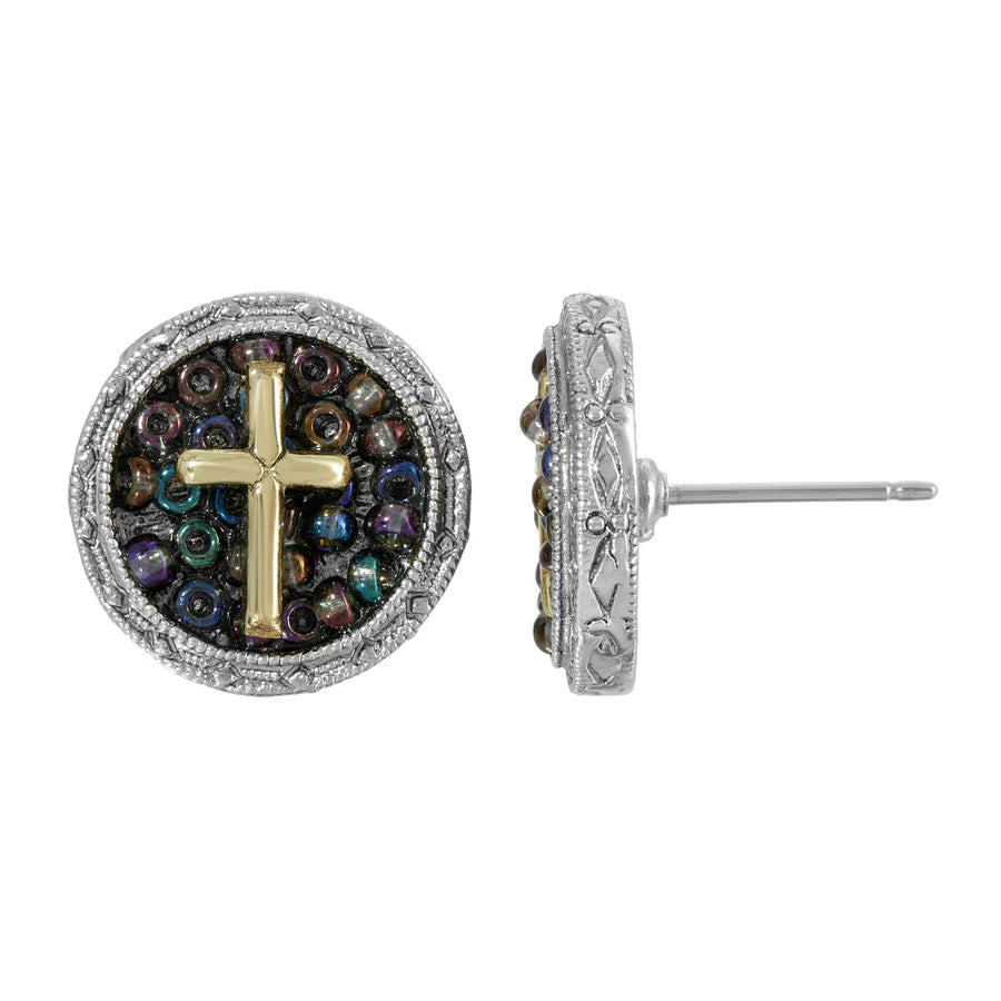 A well designed intricate detailed oval pewter frame with multi colored seeded beads and gold tone cross at the center.