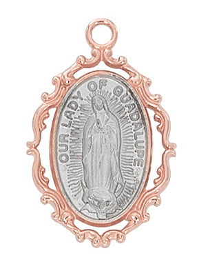 Two Tone Sterling Silver Rose Gold Guadalupe Medal with 18" Chain & Box. Made in the USA.