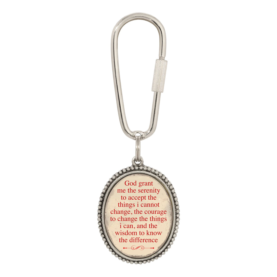 Take this special prayer anywhere you go! Made perfect for personal use & gifting. Featuring an antiqued oval pendant with the prayer, "God, grant me the serenity to accept the things I cannot change, courage to change the things I can, and wisdom to know the difference. The pendant dangles from a carabiner with an easy to use screw lock.