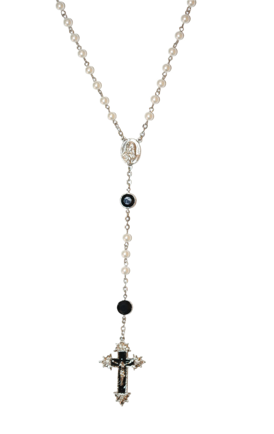 22" ROSARY SILVER TONE WITH FAUX PEARL BEADS AND BLACK SWAROVSKI CRYSTAL