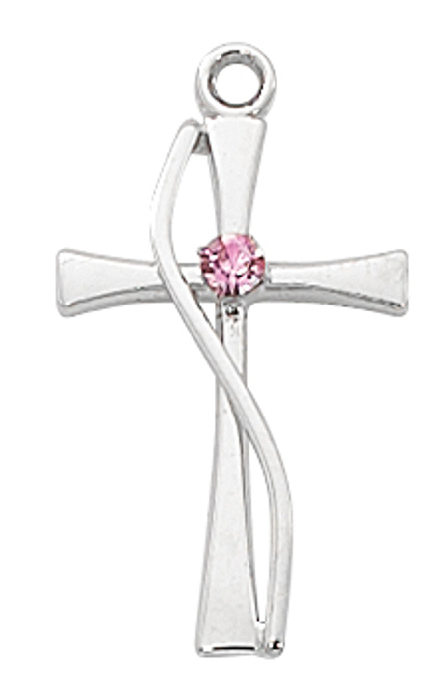 Sterling Silver Wire Cross with Rose Colored Stone and 18' Rhodium Plated Chain