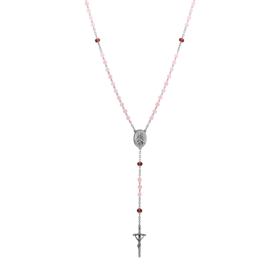 This rosary necklace features delicately rose shaped pink glass beads linked together with a gleaming silver-tone chain and accented with amethyst crystals. A detailed centerpiece medallion of our Lady Of Guadalupe with the reverse enameled pink and connects to a crucifix pendant, creating a classic devotional design. The arrangement of beads and accents offers both beauty and meaning, making it ideal for prayer or as a thoughtful gift.