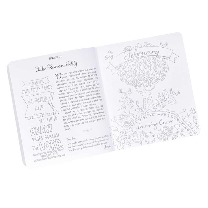 Flashes of foil accent this pretty-in-pink softcover book. Each dated page features a teen-worthy devotional, along with an easy-to-understand Scripture to color, and a closing prayer prompt. Topics include our relationship with God and others, spiritual growth, Bible-based practical life tips, and more! The thickness of the bright white paper keeps the color from bleeding through.