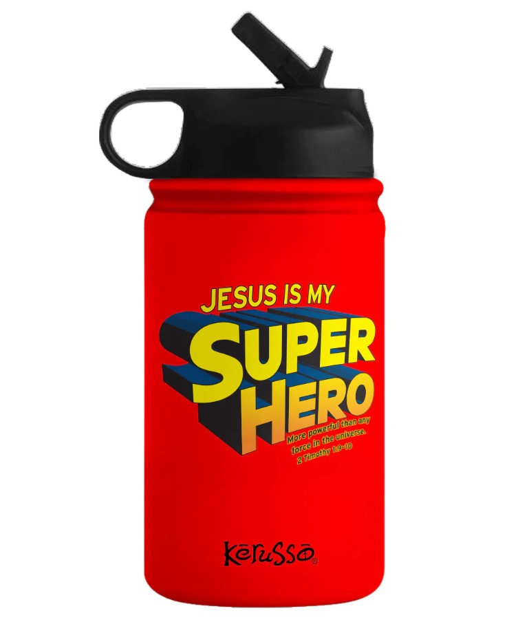 Help kids share their faith in the awesome power of Jesus with this cool “Super Hero” 12 oz. Sports Bottle w/Straw by Kerusso® Kidz in Red. Keep them hydrated at home, school, and play. Meaningful designs by Kerusso Kidz share your child’s love for Jesus with the world wherever they go.