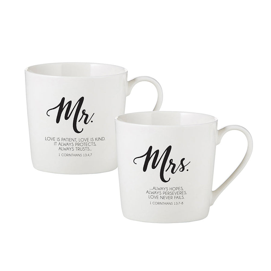 Set of 2, creamy white, bone china Mr. & Mrs. mugs in a classic, contemporary style. Gift boxed set of 2 with black print. Mr. Mug reads "Love is patient- love is kind- love always protects- always trusts - 1 Corinthians 13:4,7" and the Mrs. Mug reads "Always hopes- always perseveres- Love never fails - 1 Corinthians 13:7-8". Mugs hold 14-ounces and measure 3.75-inches high. Lighter weight, stronger and less brittle than ceramic, bone china is a premium choice for dinner and drinkware that is microwave and dishwasher safe. Excellent for weddings, bridal showers, anniversaries, commitment ceremonies, rehearsal dinners, bride tables and more.