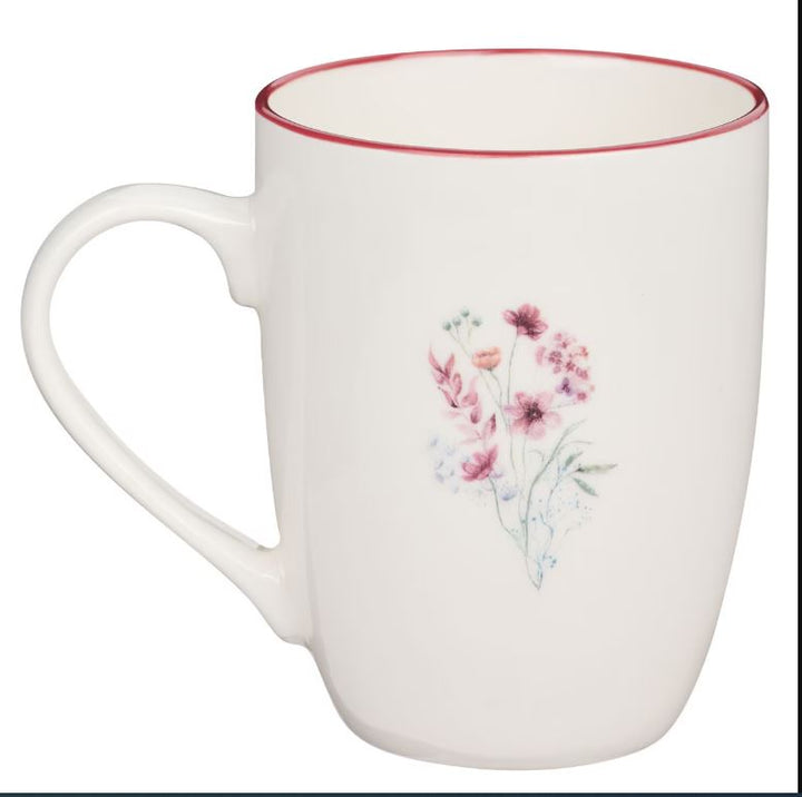 A coral-colored circular frame on the front of the mug is adorned with an array of delicate rosewood pink wildflowers. Inside the frame, you'll find an inspiring message in coral screen-printed lettering: