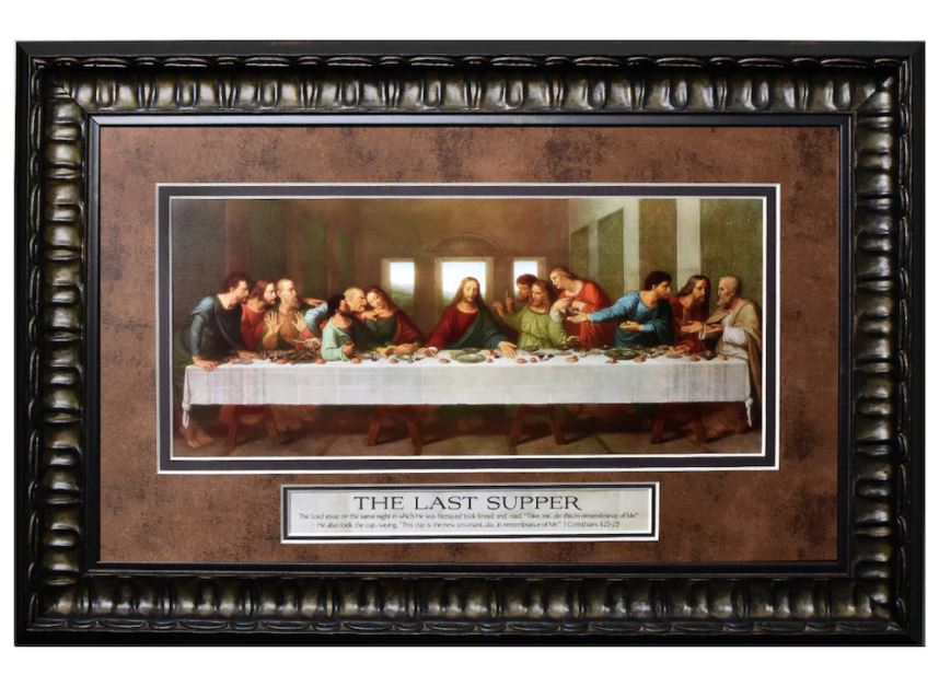 Beautiful and elegant framed wall art of The Last Supper, with scripture quote in separate mat window; double matted with glass and dark finish.