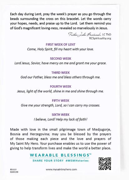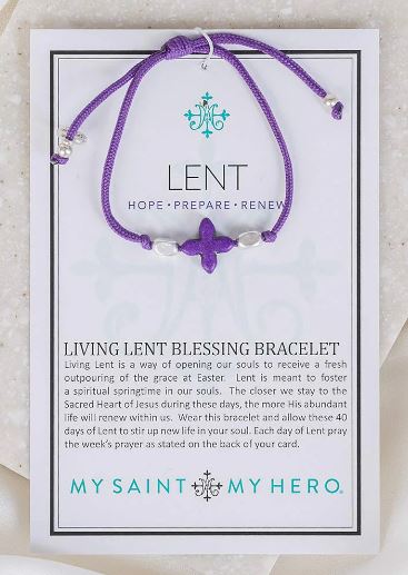 Living Lent is a way of opening our souls to receive a fresh outpouring of the grace at Easter. Lent is meant to foster a spiritual springtime in our souls. The closer we stay to the Sacred Heart of Jesus during these days, the more His abundant life will renew within us. Wear this bracelet and allow these 40 days of Lent to stir up new life in your soul. Each day of Lent pray the week’s prayer as stated on the back of your card.