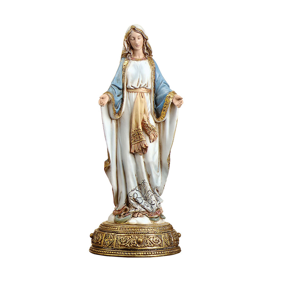 Head bowed, eyes closes, hands outstretched, Our Lady of Grace seems to pray for us. This statue shows her beautifully clad, a serene expression on her face. She stands with her foot upon a serpent. The statue rests upon an ornate base which has a small drawer worked into its design. The drawer holds a small scroll with the Memorare printed on it. Order this statue to place in your home - it will surely draw the attention of all who see it and inspire prayer.