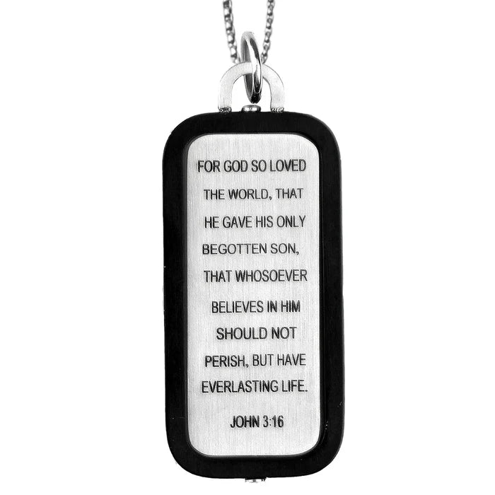 Share a message of faith when you wear this bold “John 3:16 Cross” Necklace by Kerusso® in Silver/Black on a sturdy box chain. Eternal life is a concept our human brains can only scratch the surface of, but God loves us so much, He sent Jesus to die on the cross in exchange for our sins. We have hope and a future because God loved us enough to save us, paying an incredible price in the process.
