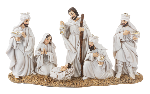 Ensure that the birth of the savior is at the heart of your Christmas celebration with this lovely figurine of Joseph, Mary, Baby Jesus and the 3 wise men. The figurines are dressed in white and set on a base carved like straw, giving texture and depth to this depiction of the Holy Family that makes a gorgeous focal point on a table, mantle, window display or as part of a Nativity scene.