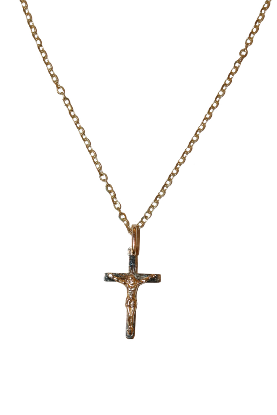This golden crucifix measures .63" x 1". It rests on a delicate gold 18" rolo chain with a spring ring clasp.