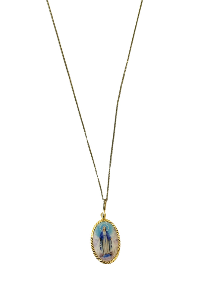 This multicolor miraculous medal image rests in a 14kt pendant that measures .5" x .75". It rests on a gold 20" curb chain with an oval lobster clasp.