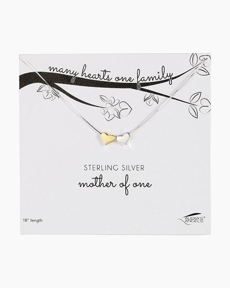 Mother of One Sterling Silver necklace. Features two hearts, one sterling silver and one sterling silver with gold plate.