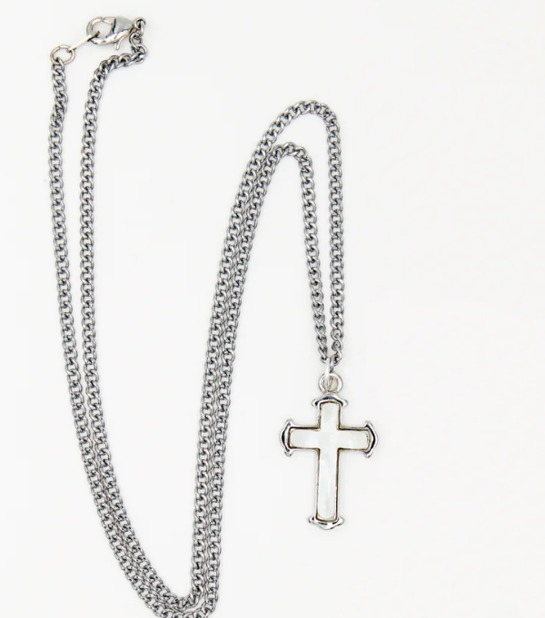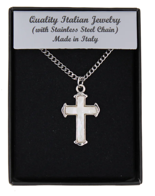 Celebrate the sacred milestone of First Communion with this elegant and timeless bracelet set and necklace. This silver-plated bracelet features delicate hearts and crosses with a beautiful mother of pearl inlay that beautifully complement the cross pendant on the necklace. The mother of pearl inlay, adds a touch of natural beauty and iridescence that symbolizes purity and grace.
