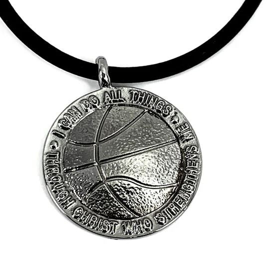 Basketball Necklace Gunmetal Color Finish is made from a special lead free pewter with Gunmetal Color Finish that is made right here in the USAThis round basketball pendant with gold finish pendant is embossed text that reads "I can do all things through Christ who strengthens us". The necklace comes on 22 inch black rubber with two inch extender that can expand the necklace to 24.