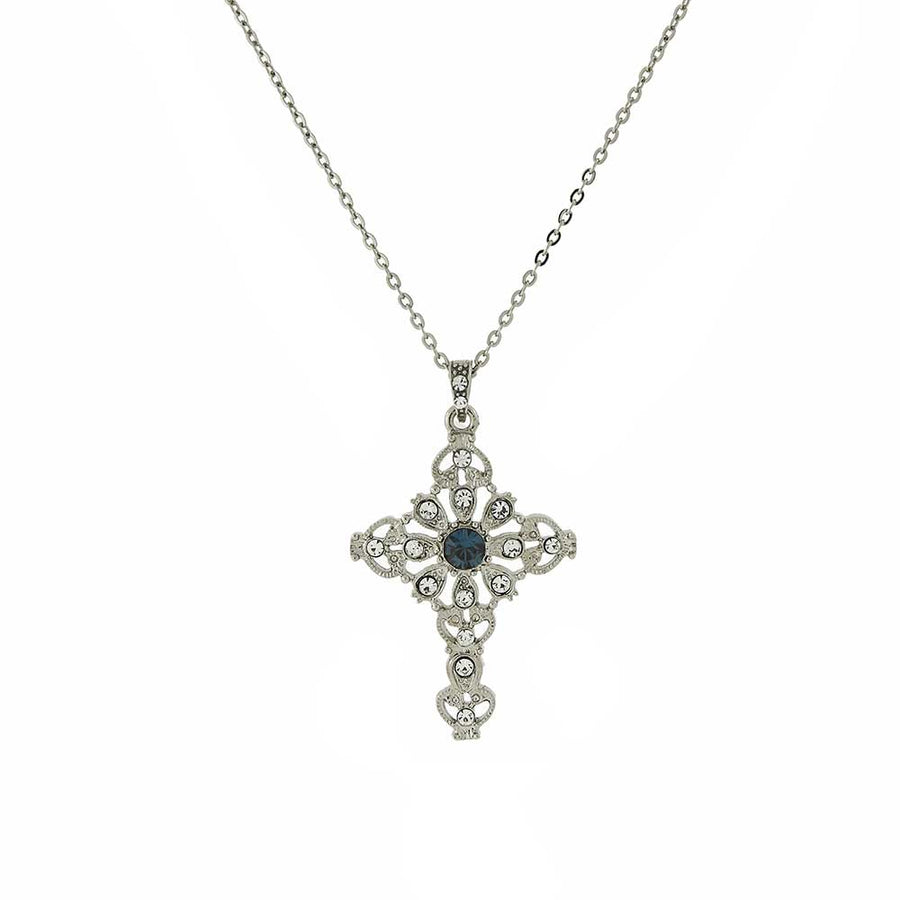 This beautifully ornate silver tone cross necklace features a round cut blue crystal center stone surrounded by sparkling clear crystal accents. Comes packaged in a Symbols of Faith gift box.