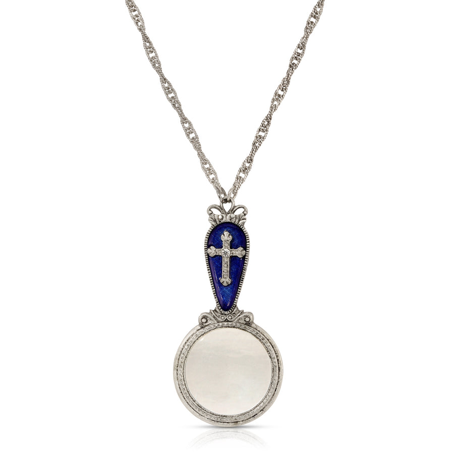 This inspirational magnifier necklace is made perfect for anytime, anywhere. This vintage inspired magnifying glass featuring sapphire blue hand enameling, a cross with crystal accent and a round magnifier with 2-3 times power.
