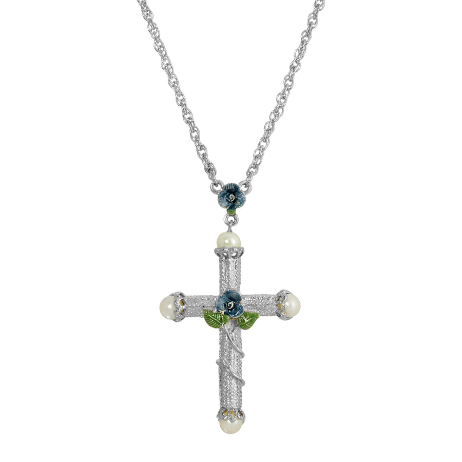 This lovely silver tone cross necklace features an intricate design embellished with a blue enamel flowers and fashion pearl accents on the ends. Comes packaged in a Symbols of Faith gift box.