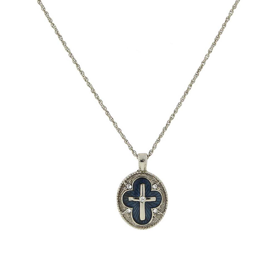 Stunning silver tone cross pendant is set in dreamy blue enamel and features shimmering clear crystal accents. This cross and enamel pendant necklace is dainty and chic and would be a delicate fashionable accessory for any occasion. It makes a perfect gift year round and special gift during the holiday season. Matching earrings available.
