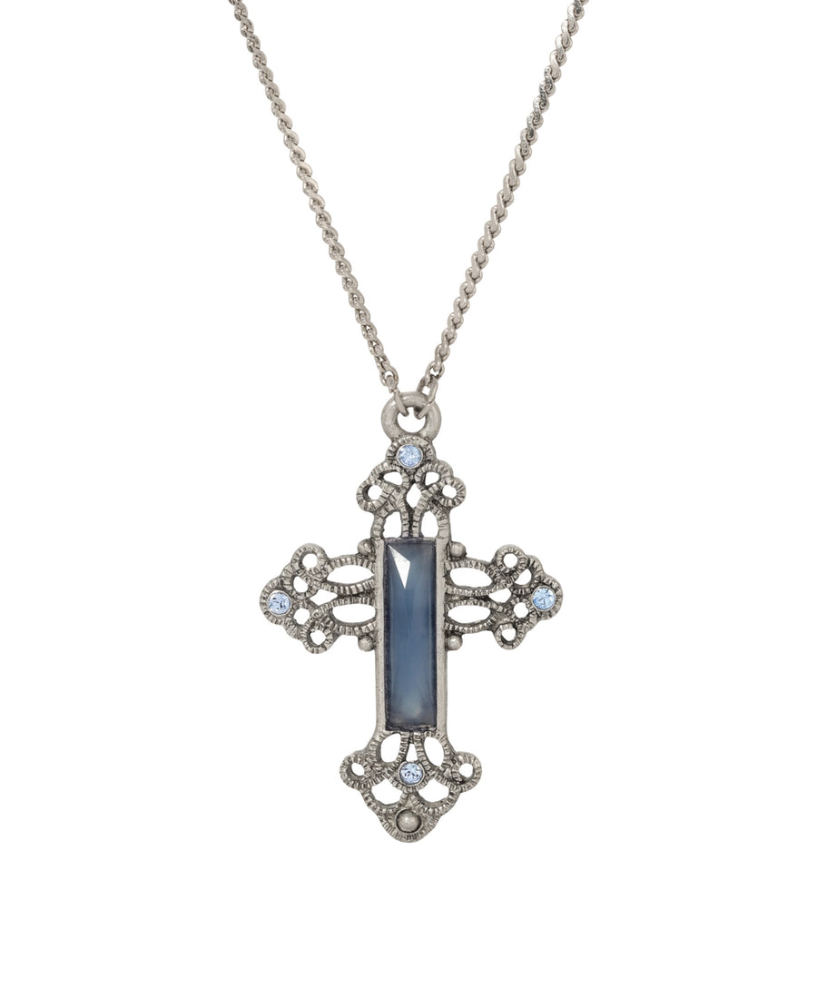 Show your spirituality with this beautifully designed silver-tone filigree cross pendant with blue center stone.