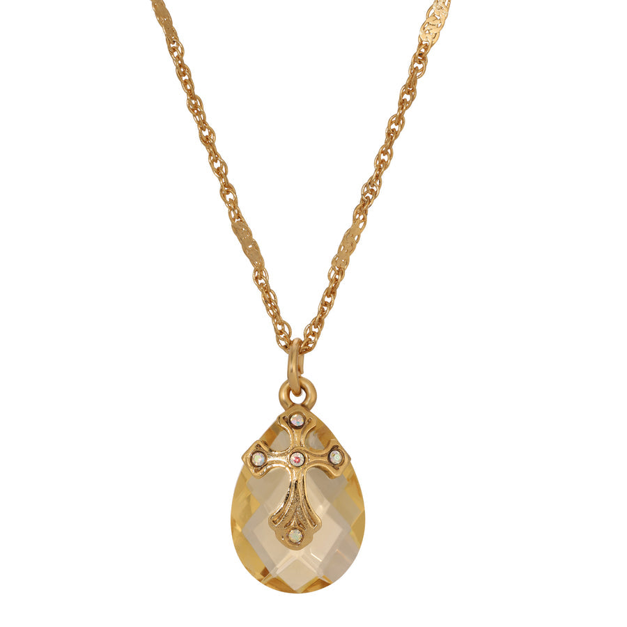 Briolette Crystal and Cross Pendant Necklace - Gold Tone and Yellow