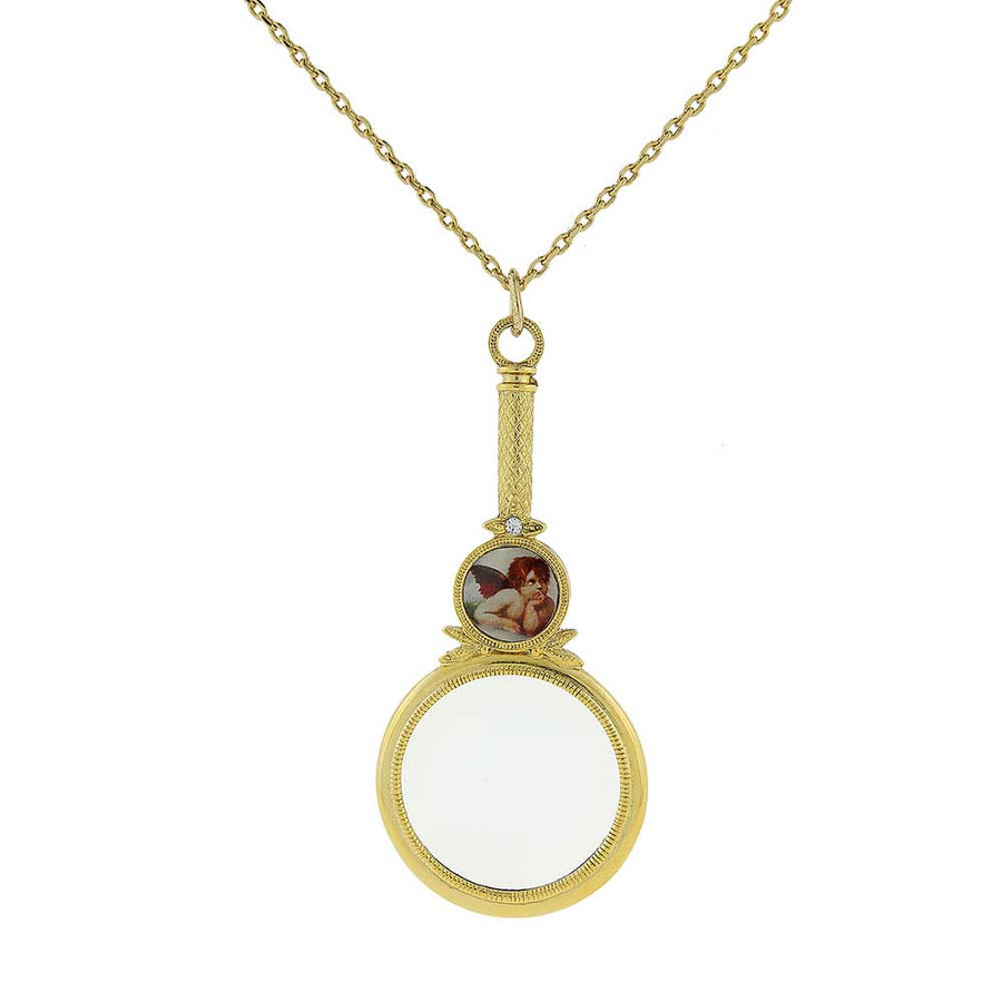 A charming little keepsake for the vintage-obsessed. This necklace features 14K gold dipped magnifying glass pendant with a guardian angel decal on a 36-inch chain. Magnifies 2-3 times for functional fashion that youll love.