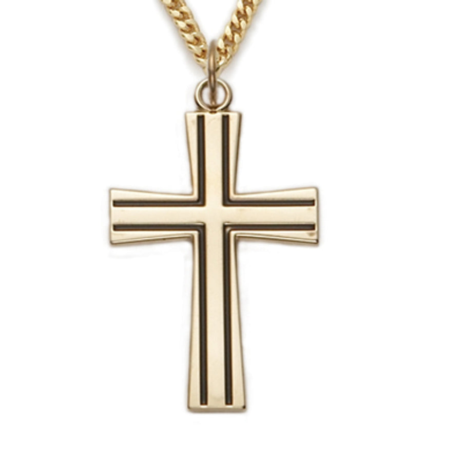 Gold Over Sterling Cross with Black Fill Lines, 24" Gold Plated Brass Chain, & Deluxe Gift Box.
