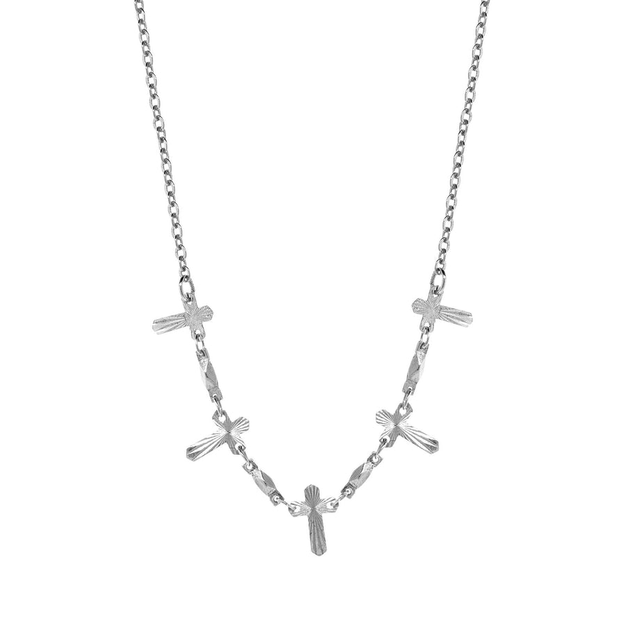 A quintet of crosses! You'll dazzle the crowd with this eye-catching necklace featuring a set of five textured silver-tone crosses. Simply chic, minimal and intriguing, this necklace can be layered with other jewelry pieces to express your unique style or wear alone for a minimalist statement. A lovely accessory and symbol of life and spirituality, the cross necklace is a reminder of our spiritual selves and of the opportunities that faith gives us.